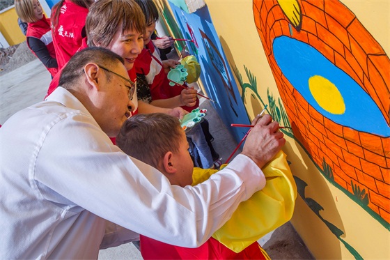 现场,孩子们和大人们共执画笔,在新建的教室墙面上绘制彩色图案。在爱心人士们的关怀下,孩子们未来的生活必将更加炫丽缤纷。