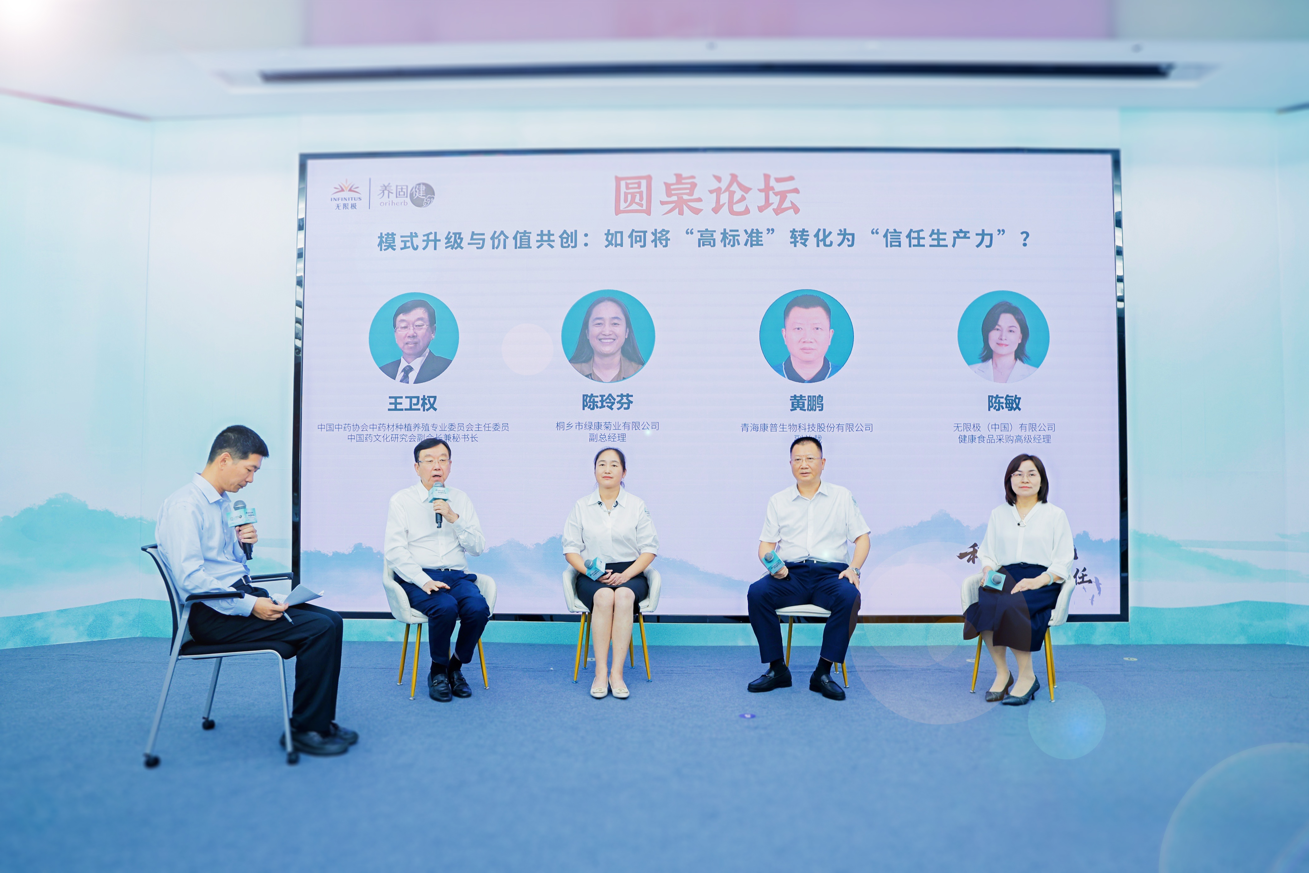 在精彩的主题演讲之后,一场以模式升级与价值共创:如何将“高标准”转化为“信任生产力”为主题的圆桌对话紧接着展开。王卫权、无限极(中国)有限公司健康食品采购高级经理陈敏、青海康普生物科技股份有限公司副总裁黄鹏、桐乡市绿康菊业有限公司副总经理陈玲芬4位与会嘉宾,围绕模式升级后的挑战、产业链协作、消费者信任等话题展开深入探讨,各方畅所欲言为“高标准转化为信任生产力”提供了宝贵建议。