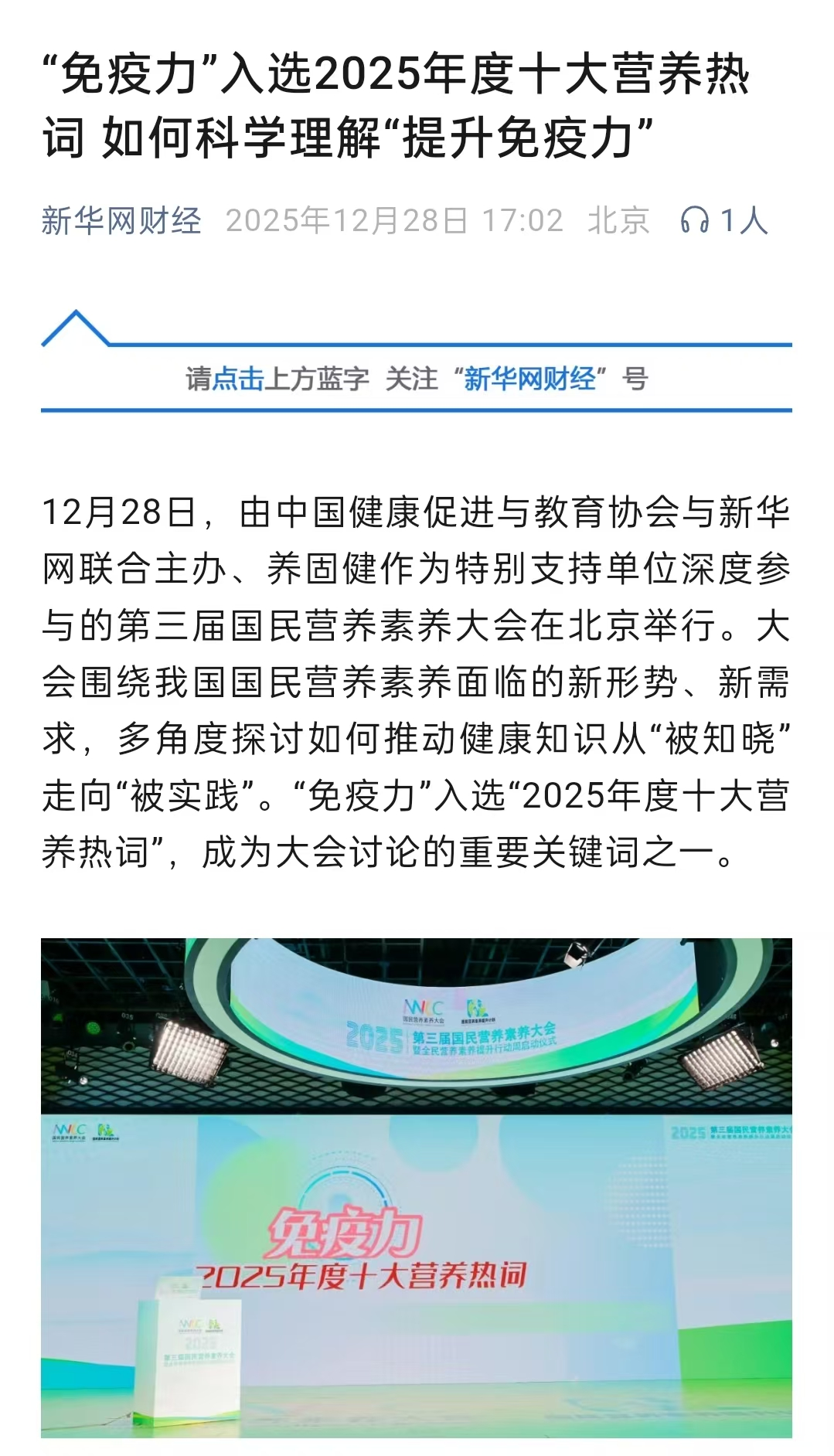“免疫力”入选2025年度十大营养热词,公众对免疫力和营养健康的关注持续升温。日前,在由中国健康促进与教育协会与新华网联合主办、养固健作为特别支持单位深度参与的第三届国民营养素养大会上,“免疫力”成为大会讨论的重要关键词之一。